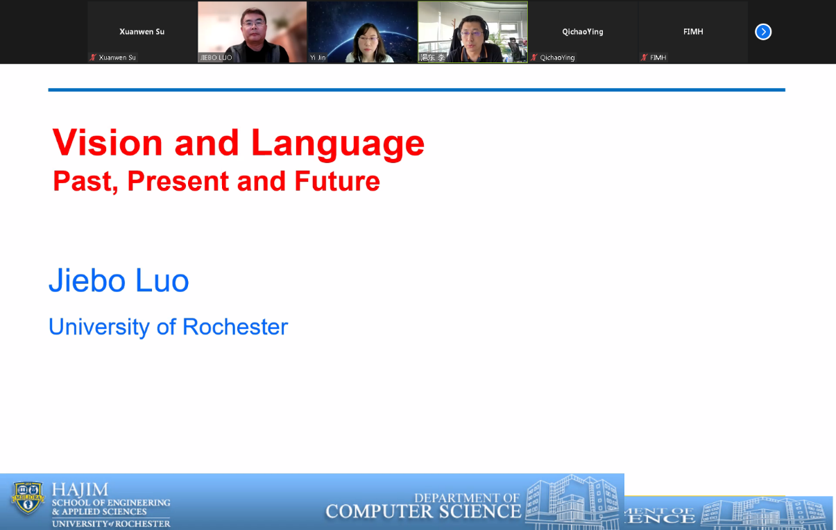 本次活动邀请到了来自美国罗切斯特大学的罗杰波教授,罗教授是IEEE会士、ACM会士、SPIE会士、AAAI会士以及IAPR会士,现任IEEE TMM期刊总编,罗教授的主要研究兴趣领域包括计算机视觉、NLP、机器学习、数据挖掘、计算社会科学和数字健康。罗教授和大家探讨的主题是“计算机视觉和语言:过去,现在和未来”。活动由草榴社区 金一教授主持,草榴社区 副院长李浥东教授开幕致辞,200多名师生在线参与了本次活动。